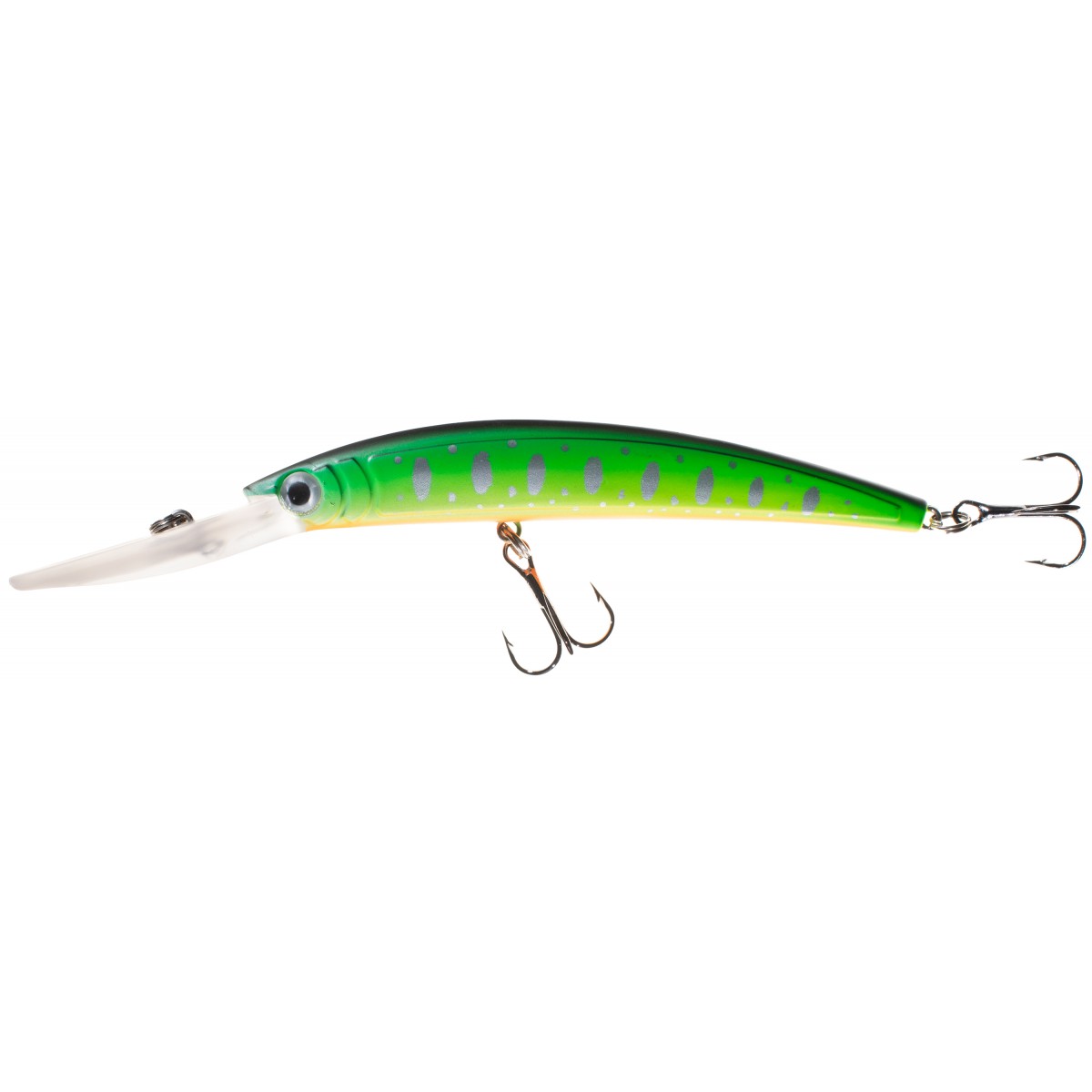 A floating wobbler with an elongated lip that enables effective coverage of deeper water sections during classic retrieve and trolling. It works best when retrieved using twitching and start-stop techniques, where it dynamically flashes sideways,
